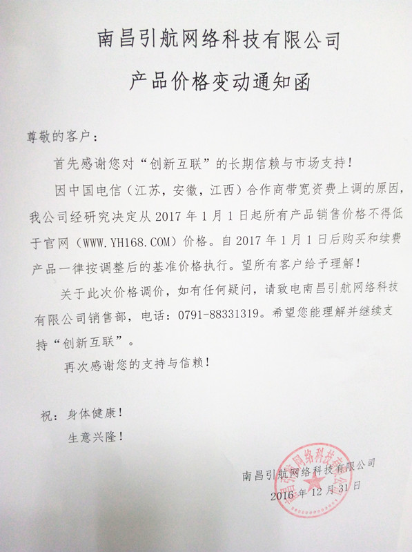 因中国电信(江苏,安徽,江西)合作商带宽资费上调的原因,我公司市场部经研究决定从2017年1月1日起所有产品销售价格不得低于官网(WWW.YH168.COM)基准价格,自2017年1月1日后购买和续费产品一律按调整后的基准价格执行,望所有客户给予理解!